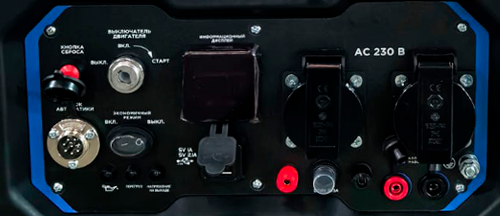 - Индикаторы на панели паказывают параметры напряжения, превышение мощности генератора, низкий уровень масла