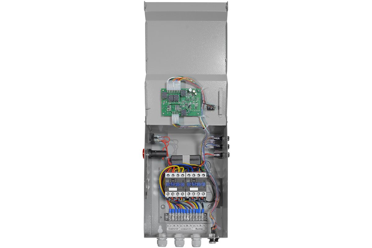 Предназначен для автоматического запуска бензинового генератора в момент пропадания основного источника электроэнергии и переключения нагрузки без вмешательства человека