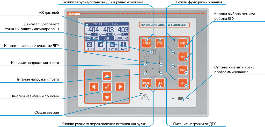 - 10 светодиодных индикаторов для отображения режима работы и технического состояния ДГУ