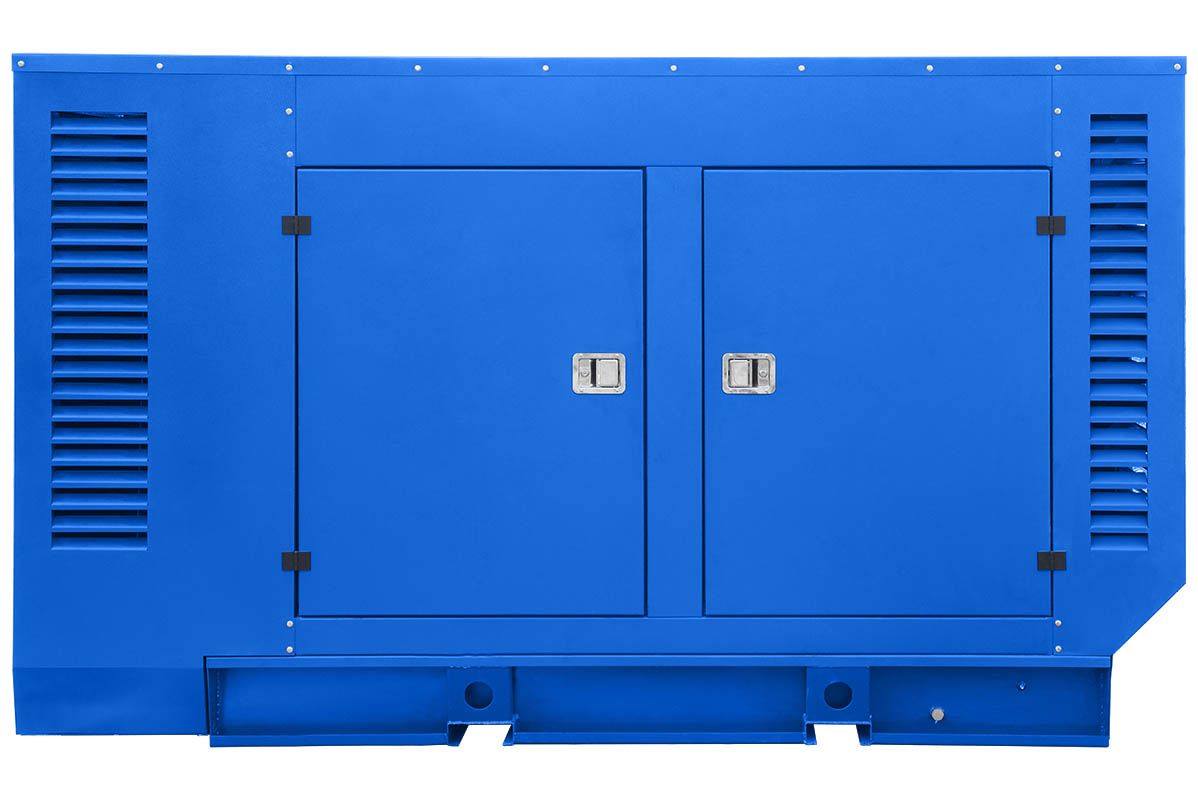 Шумозащитный кожух предназначен для защиты ДГУ от осадков, обеспечения безопасности работы и уменьшения уровня шума, исходящего от работающей ДГУ. Кожух изготавливается по раме дизель-генераторной установки из стального листа толщиной 1,5-2 мм с порошковым покрытием и дополнительным шумозащитным покрытием. Для проведения технического обслуживания кожух имеет дверцы с удобным замком. Напротив щита собственных нужд в створке двери кожуха имеется окно для визуального контроля за работой оборудования. Генераторную установку в шумопоглащающем кожухе можно эксплуатировать как в помещении, так и на улице при температуре окружающей среды от -25°С до +40°С.
